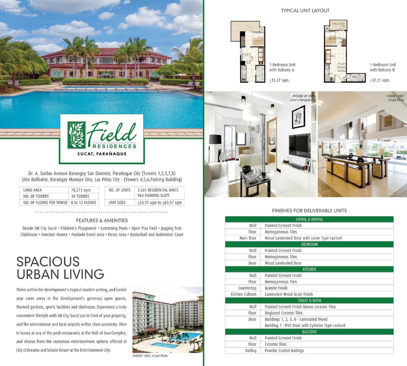 Located just south of the metro, Field Residences in Sucat, Parañaque offers sublime suburban living that adapts to your lifestyle, whether you’re independent, a newlywed couple, an OFW family, or just looking for a change of scenery. Nearby highlights include SM City Sucat, the international and domestic airport terminals of NAIA, and Entertainment City.